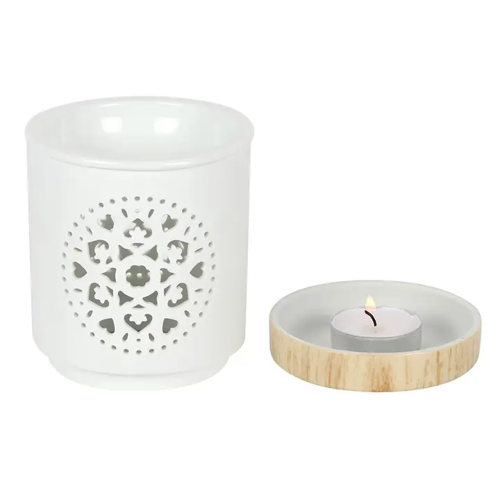 Ce brûleur-parfum en céramique blanche est orné d’un motif Mandala découpé avec une base en céramique effet bois.