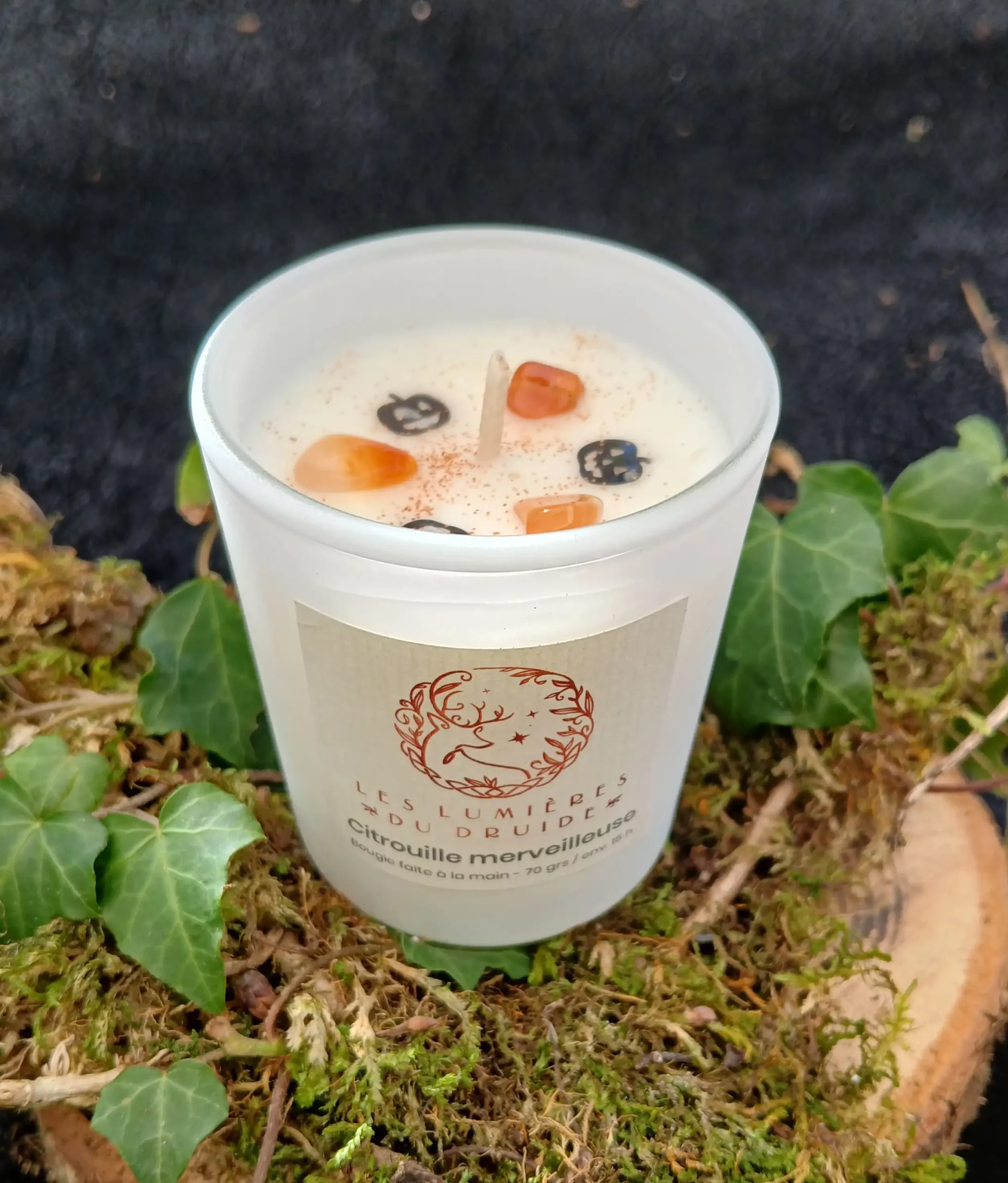 Célébrez l’esprit d’Halloween avec cette bougie unique décorée de citrouille et de pierres semi-précieuses – cornaline – pour une touche de magie et d’énergie positive